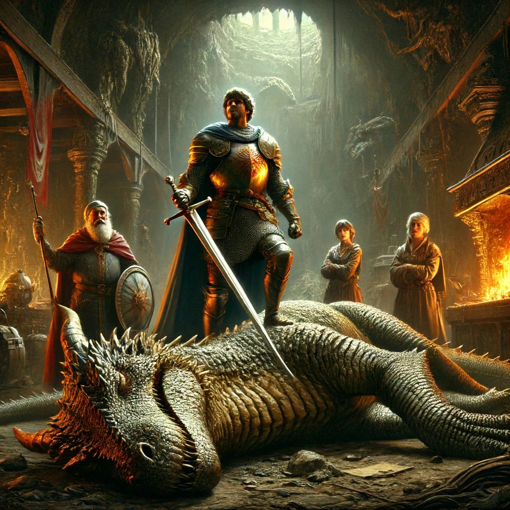 With a mighty swing, St. George plunged Ascalon deep into the dragon’s heart. The beast let out a deafening roar, its fiery breath faltering as it collapsed to the ground. Silence fell over the chamber as the warriors stood victorious, their breaths ragged and their bodies exhausted.